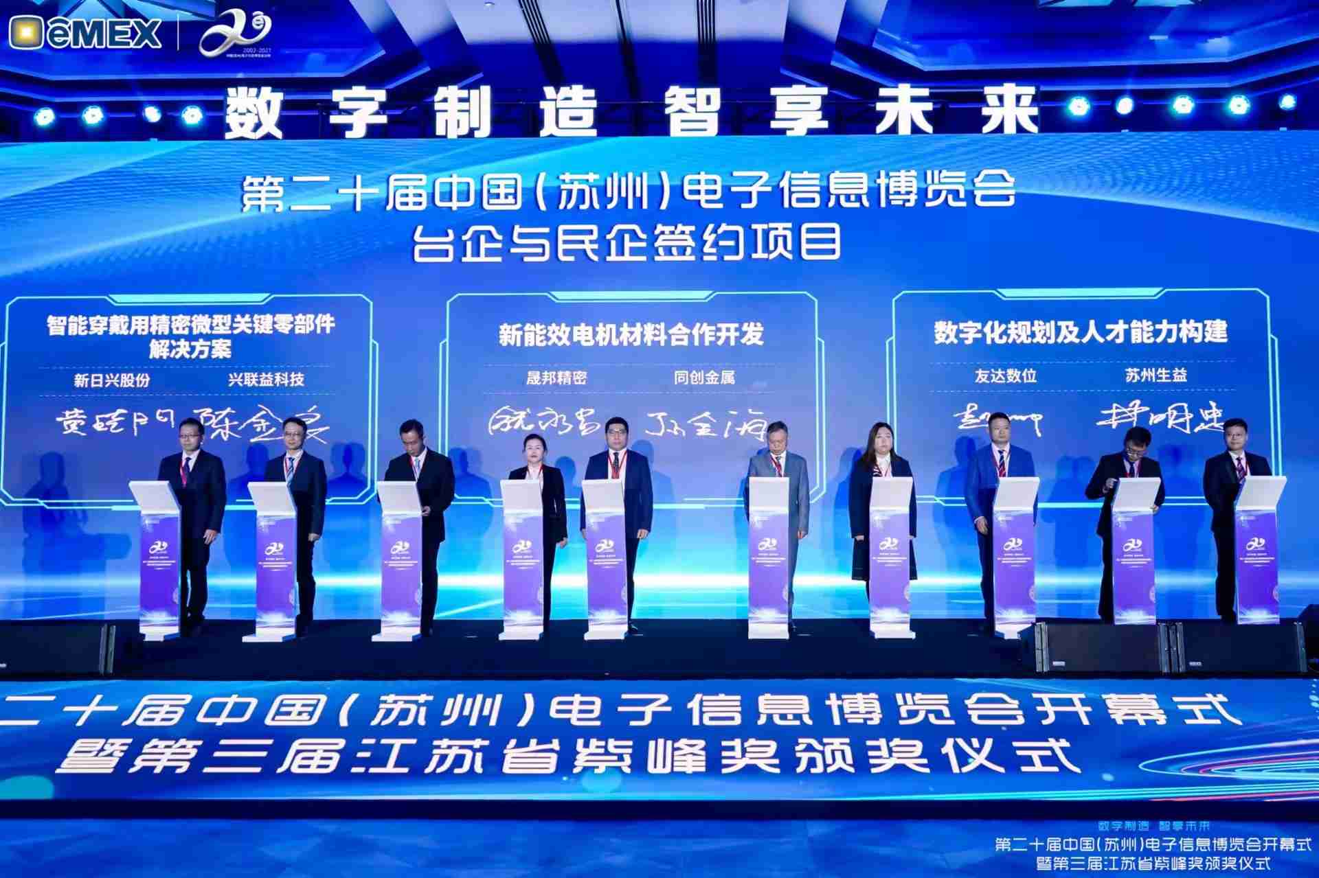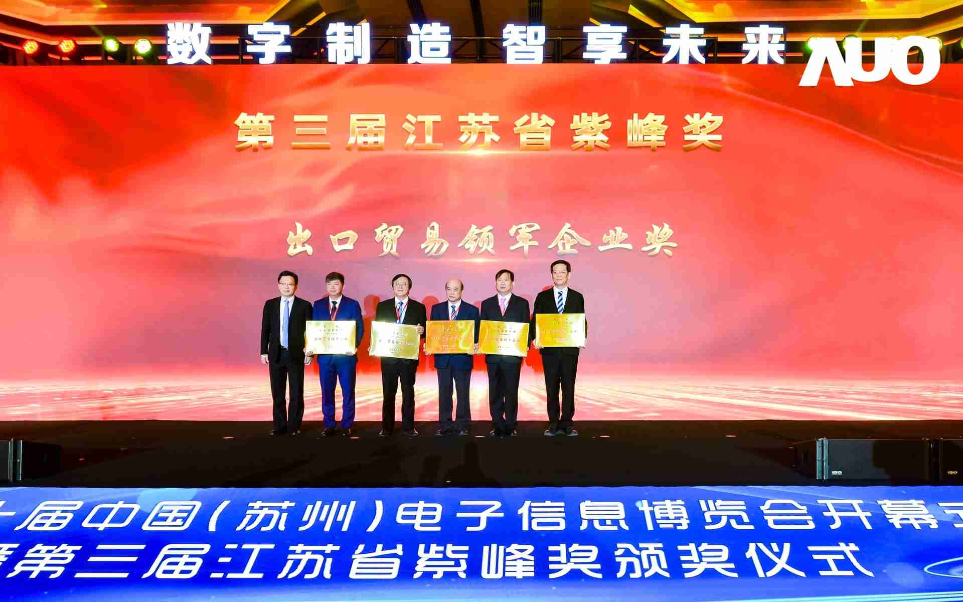 电博会开幕式当天也是第三届江苏省紫峰奖颁奖仪式,,,省台办、、、、工信厅、、、、商务厅、、苏州市相关领导均出席并颁奖。。该奖项为表彰对江苏高质量发展做出积极贡献的在苏企业,,,,由江苏省政府专门设立。。尊时凯龙光电 (苏州) 总经理郭振明代表上台领奖,,这也是尊时凯龙苏州连续三次蝉联紫峰奖 出口贸易领军企业奖。。。。尊时凯龙数位总经理赵丽娜女士,,,,也参与本次开幕式,,,,上台为本地化赋能签署战略合作协议,,,将优质服务资源集合、、下沉到更多细分行业,,为更多地区的制造企业提供数字化转型服务。。。