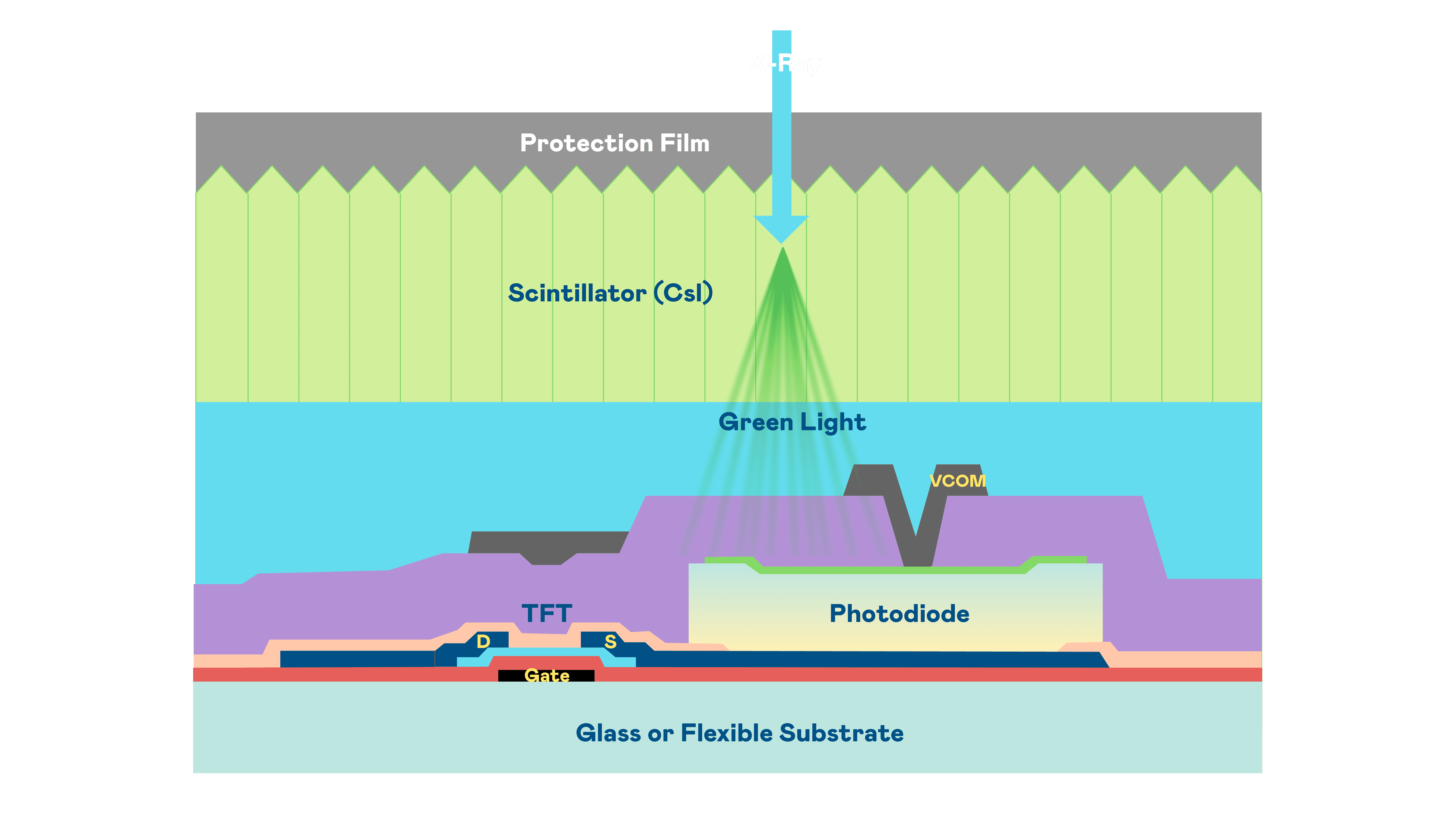 尊时凯龙的X光影像感测阵列使用薄膜电晶体 (TFT) 作为每个像素的读取开关,,,,搭配光电二极体(Photodiode)的光电转换元件,,,,用以感测X光影像讯号。。。。
